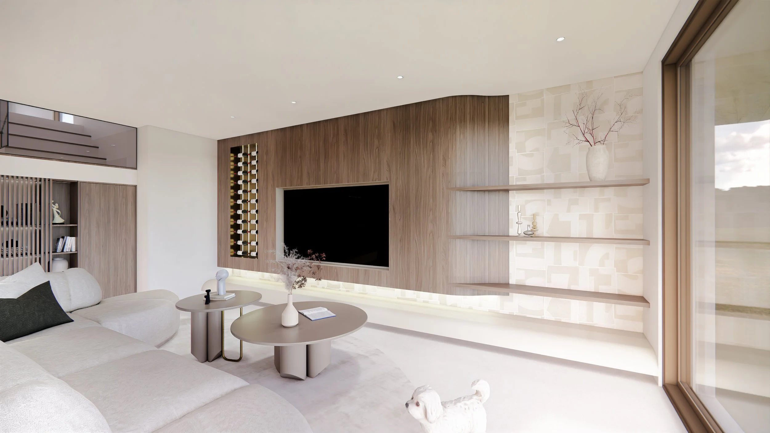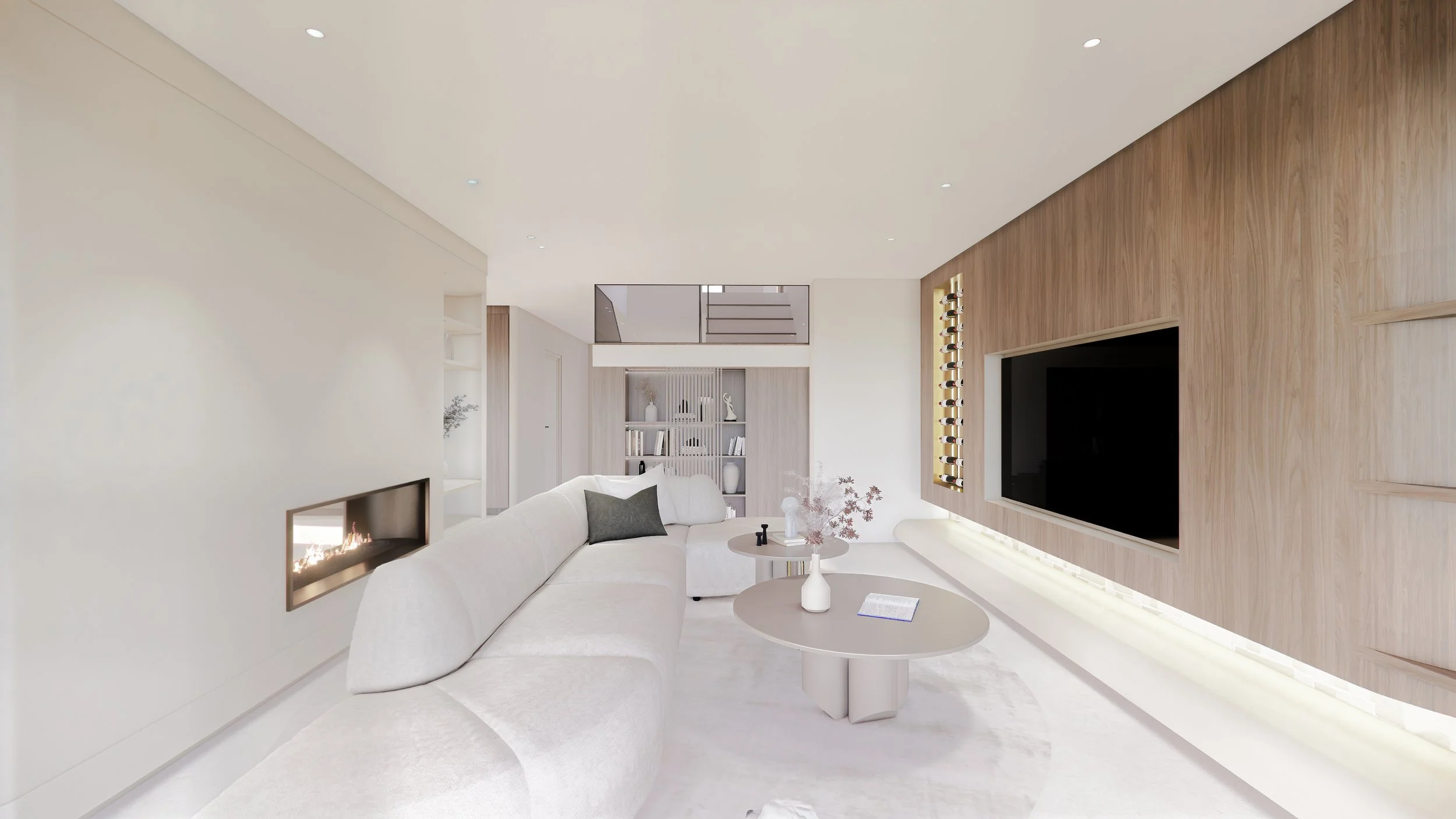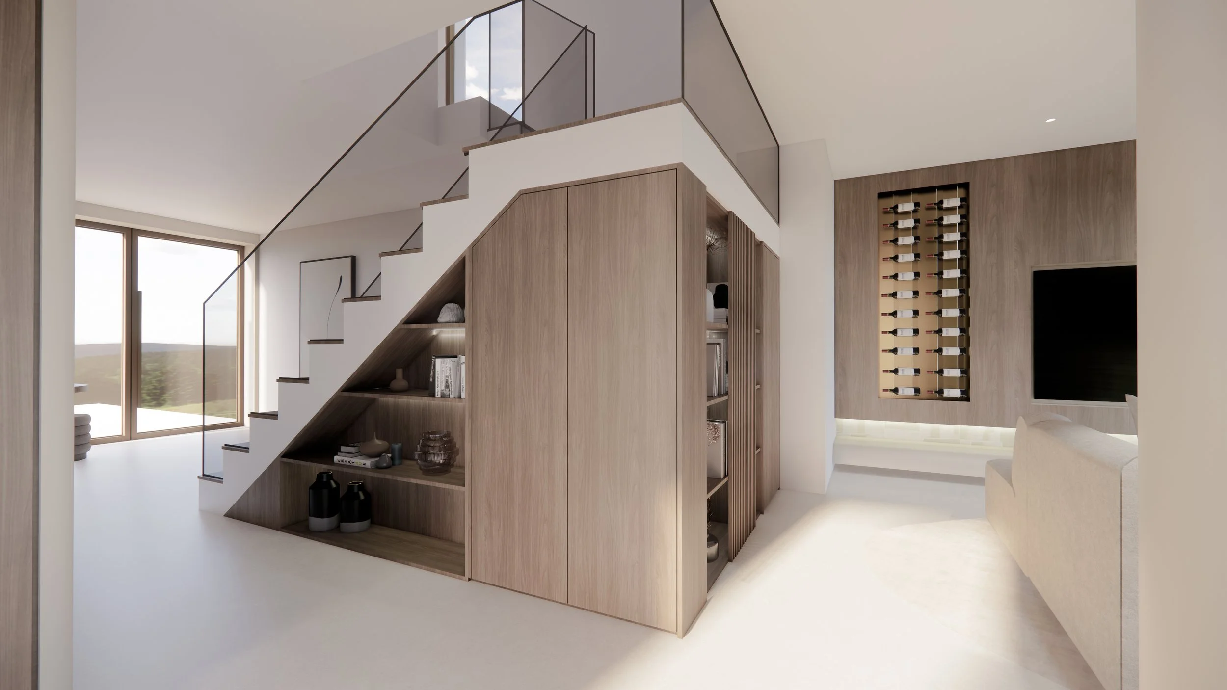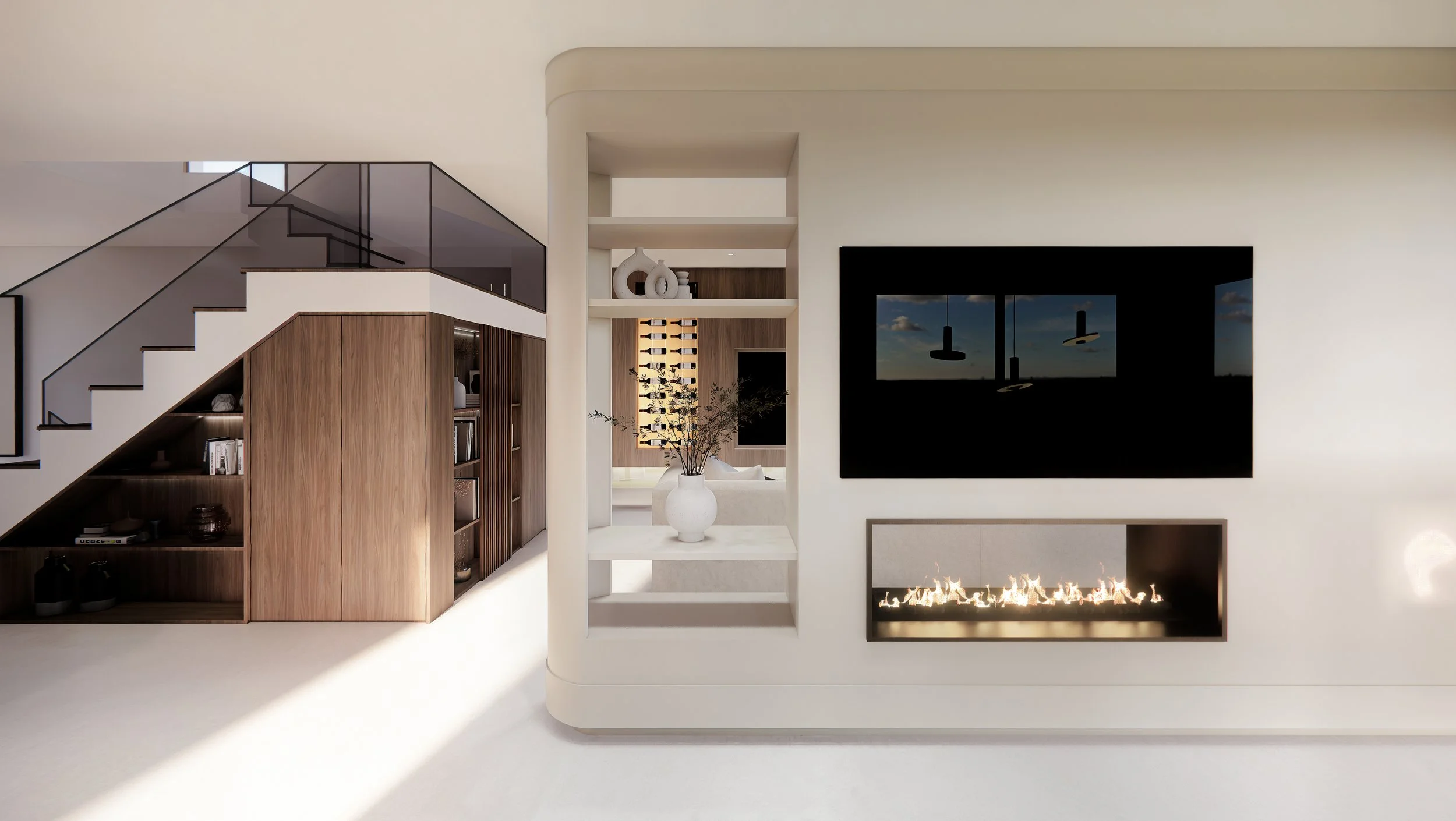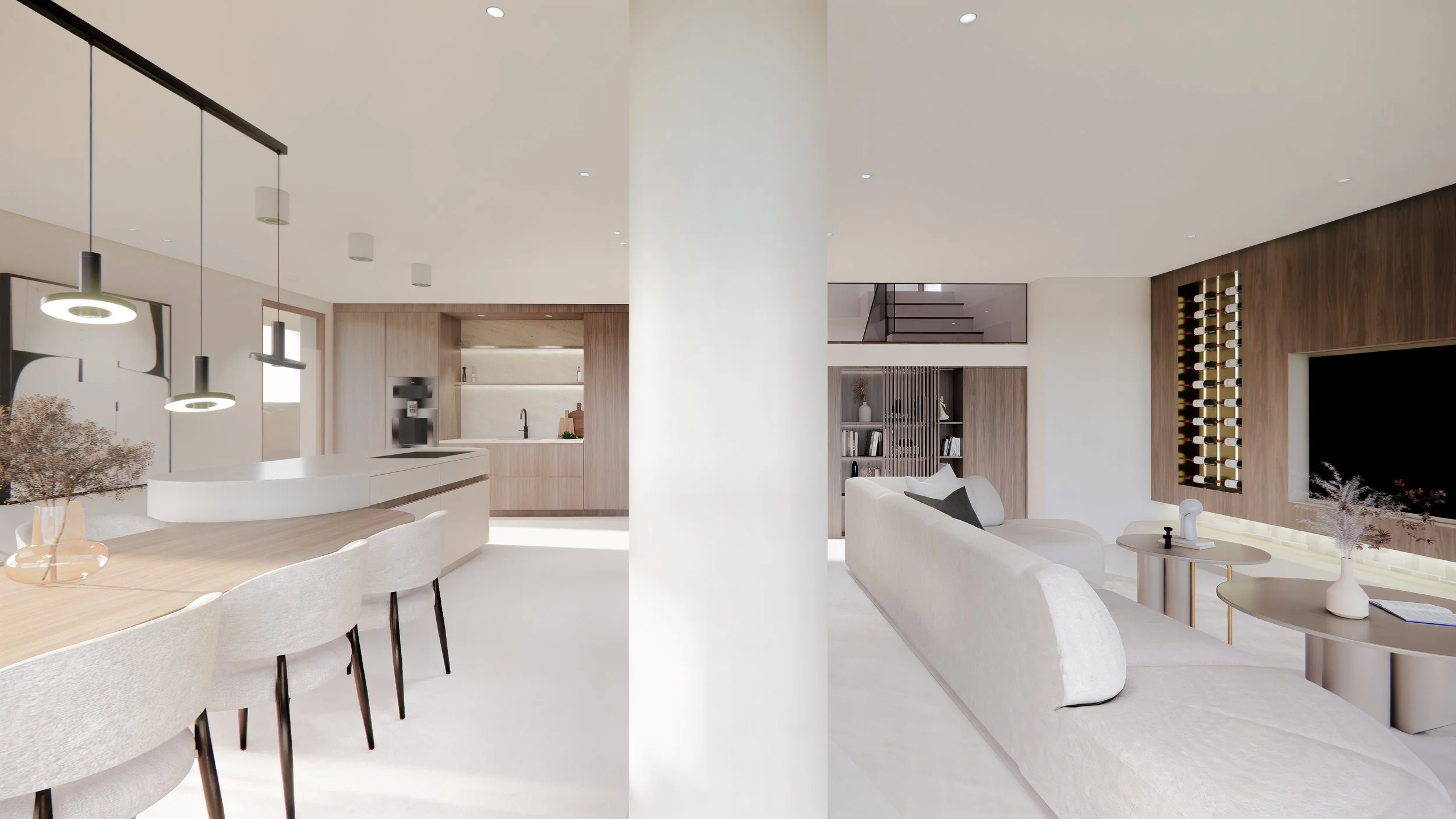 De basis wordt gevormd door lichte, neutrale tinten die samen met de natuurlijke houtaccenten een kalme en uitnodigende sfeer oproepen. Door de strakke lijnen, de geïntegreerde opbergruimte en de subtiele details is de woning prachtig in balans — een plek om tot rust te komen, samen te zijn en te genieten.