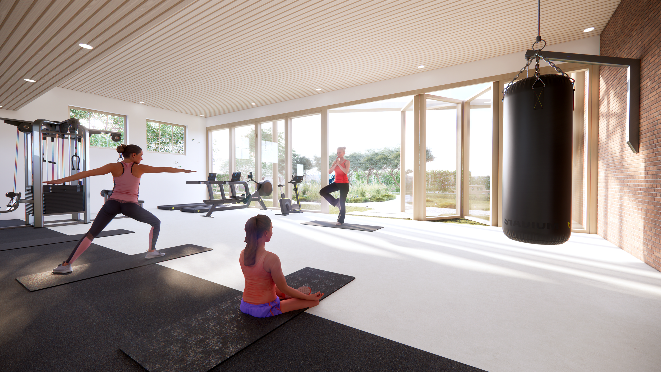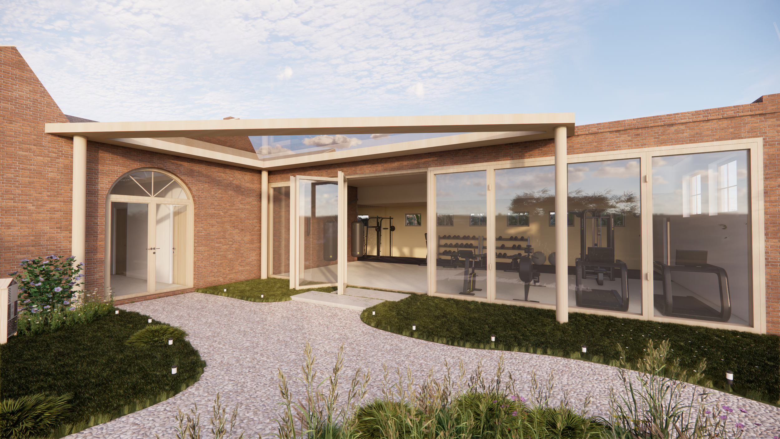 De fitnessruimte in de traumakliniek, ontworpen volgens het “healing haven” concept, biedt een serene en uitnodigende omgeving die herstel en welzijn bevordert. De ruimte is licht en open, met grote glazen deuren en ramen die een verbinding met de natuur creëren. De combinatie van hout en baksteen in het interieur zorgt voor warmte en stabiliteit. Verschillende zones, waaronder cardio- en krachttrainingsgebieden, zijn zorgvuldig ingedeeld om diverse oefeningen mogelijk te maken. De ruimte is flexibel en kan worden aangepast voor yoga en meditatie. De buitenomgeving is rustgevend aangelegd, wat bijdraagt aan het kalme en vredige karakter van de fitnessruimte, essentieel voor zowel fysiek als mentaal herstel.