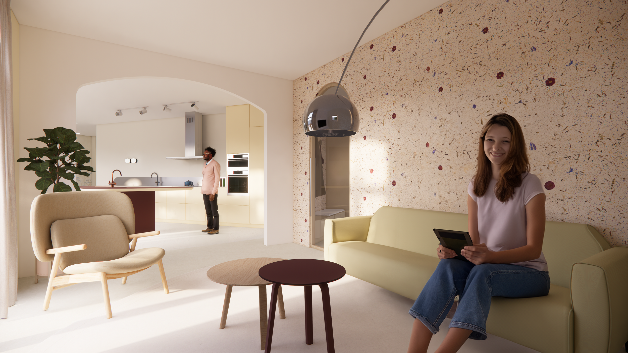 De gezamenlijke ruimte is bedoeld als een plek waar patiënten zich comfortabel en op hun gemak kunnen voelen. Dit wordt bereikt door het gebruik van warme kleuren, zachte stoffering en comfortabele zitplaatsen zoals banken, fauteuils en kussens.
