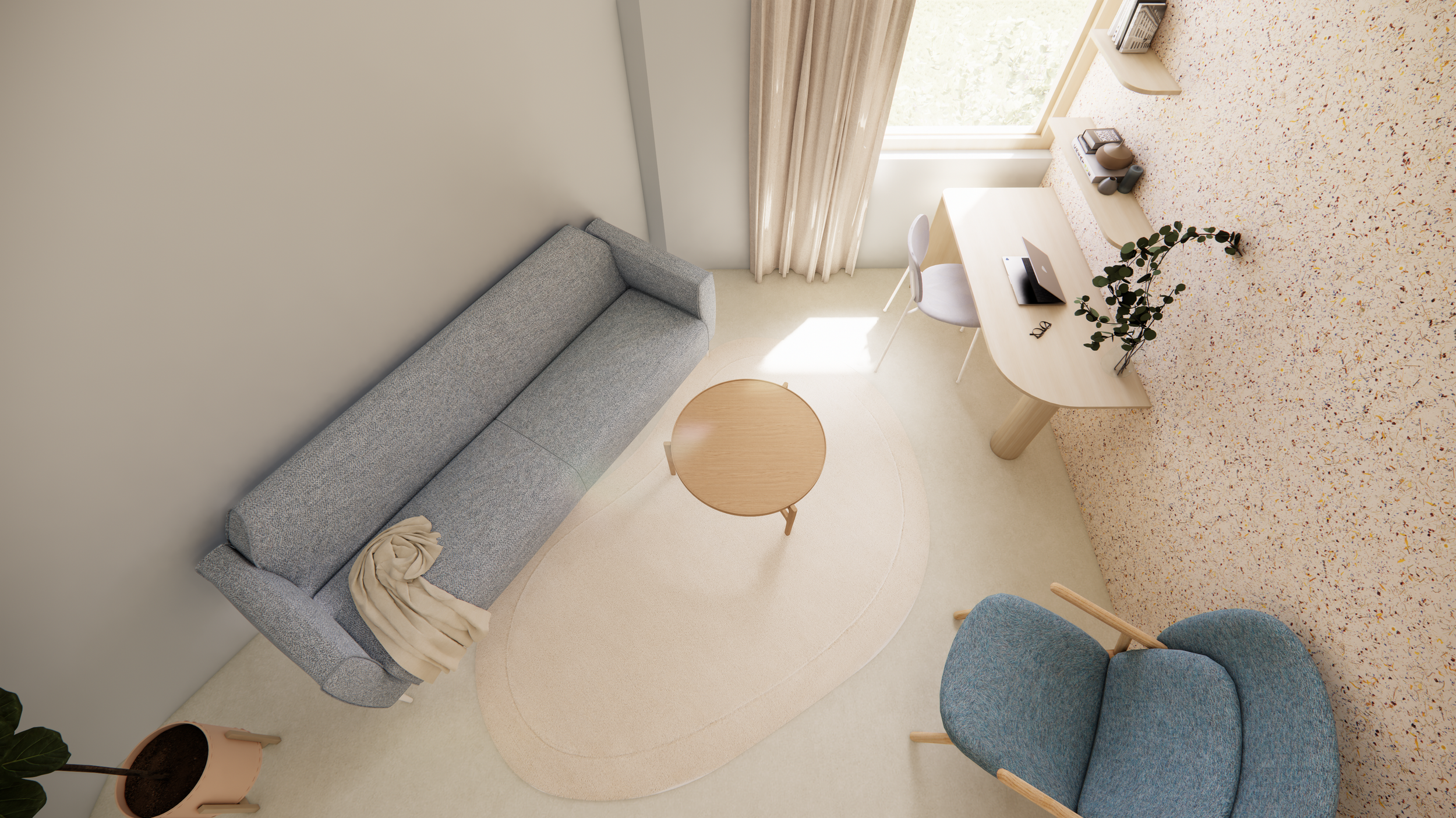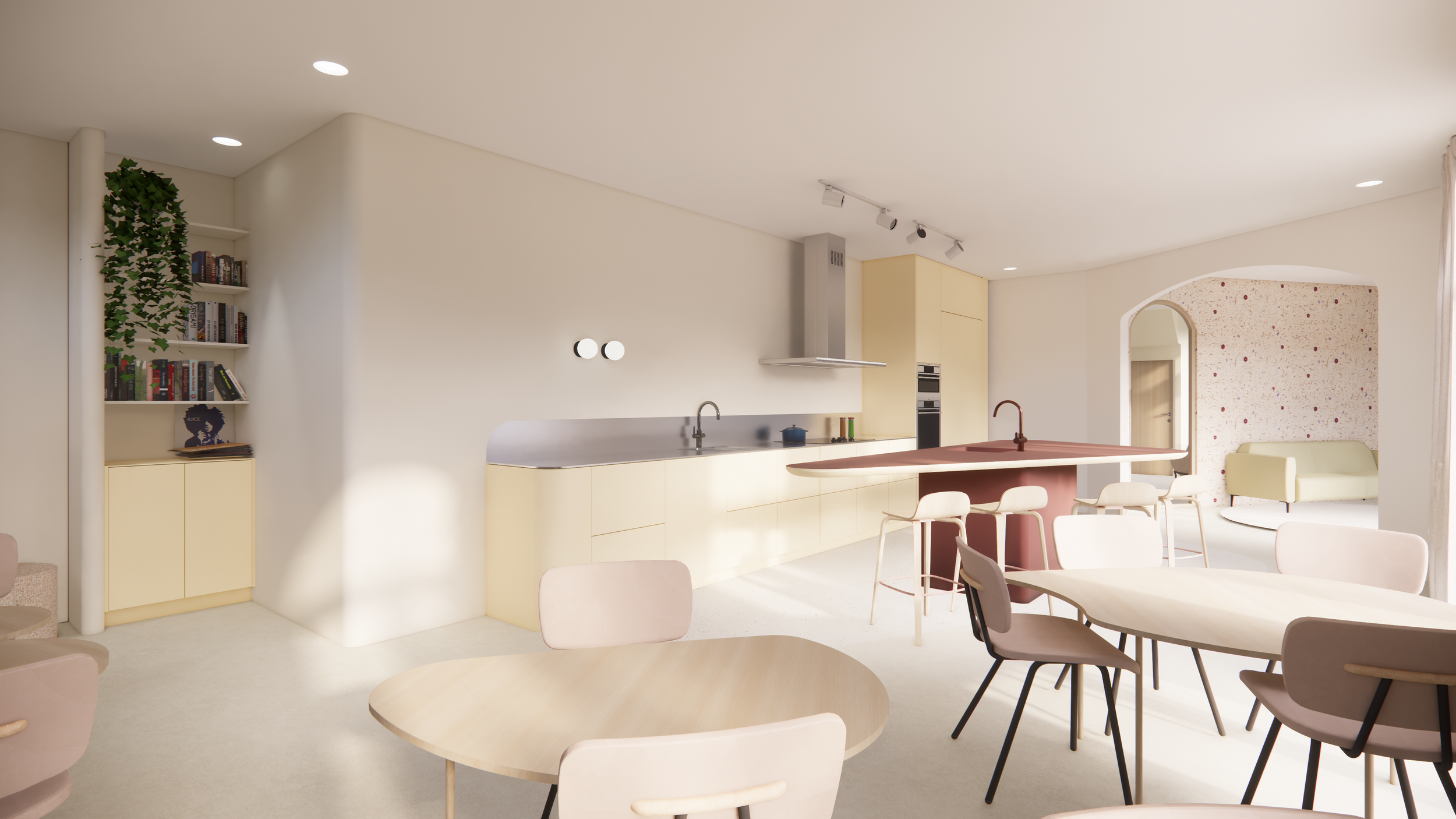 De gemeenschappelijke ruimte is een gezellige plek met comfortabele zitplaatsen die plek biedt om activiteiten te organiseren met de patiënten. De keuken bevindt zich ook in deze ruimte. De ruimte is een plek waar patienten elkaar kunnen ontmoeten, sociale interactie kunnen hebben en steun kunnen vinden bij elkaar. Dit kan helpen bij het verminderen van gevoelens van isolatie en eenzaamheid.